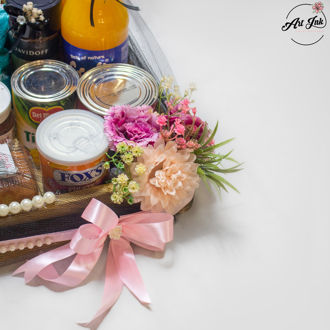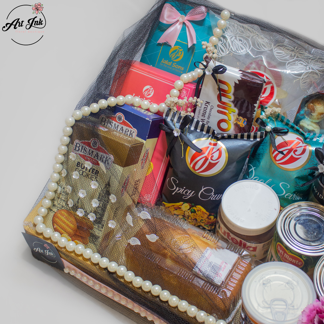 This basket offers a rich mix of snacks, sweets, and premium delights. It includes JS Masala Chips, a soft Butter Plain Cake, and 2 Frutin Juices. For cookie lovers, there are JS Almond Khatai Mini, Bismark Butter Cookies, and Bismark Rolled Oats Cookies, along with a Fox’s Fruit Tin and Prem French Heart. Savory flavors come with JS Spicy Crunch Nimko and JS Desi Sevian Nimko, while fruit lovers get Delmonte P-A Tidbits and Polac Fruit Cocktail. To add indulgence, the basket also includes Nutella Spread, JS Butter Cake Rusk, a crunchy Nutro Choc Wafer, and premium Davidoff Coffee Aroma.