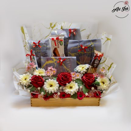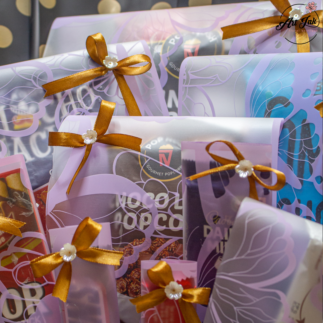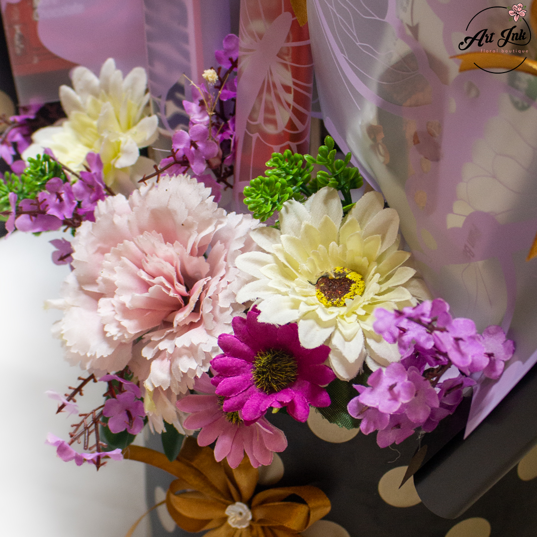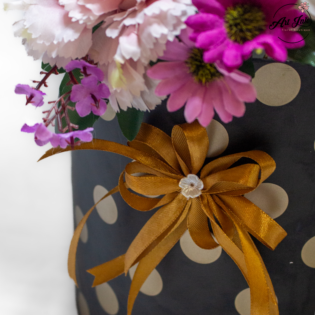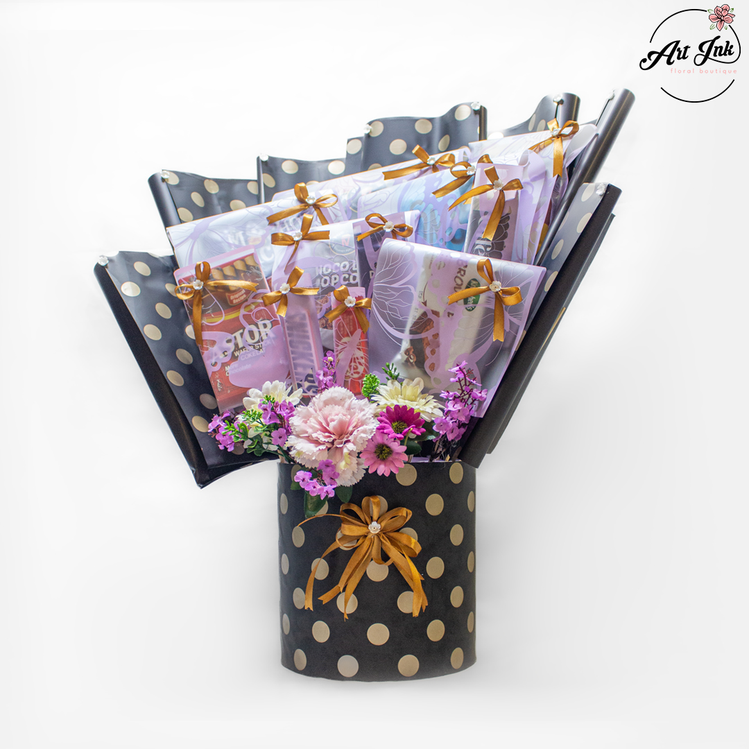 A perfect blend of sweetness and charm – this stunning arrangement features an assortment of premium chocolates beautifully wrapped with golden ribbons, paired with fresh blooms in shades of pink and purple. Presented in a chic black polka dot hatbox with a matching bow, it’s an ideal gift for birthdays, celebrations, or to make any day extra special.